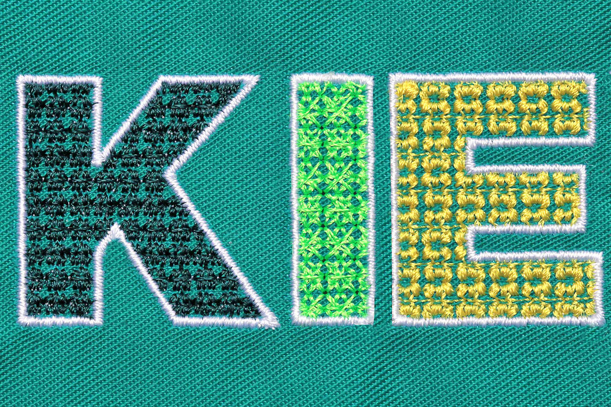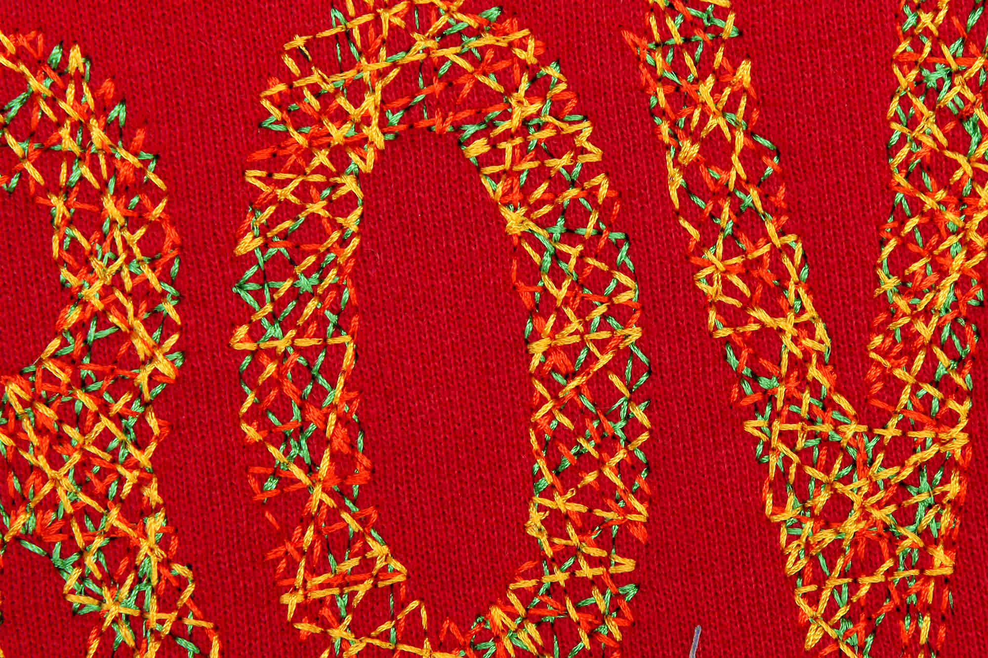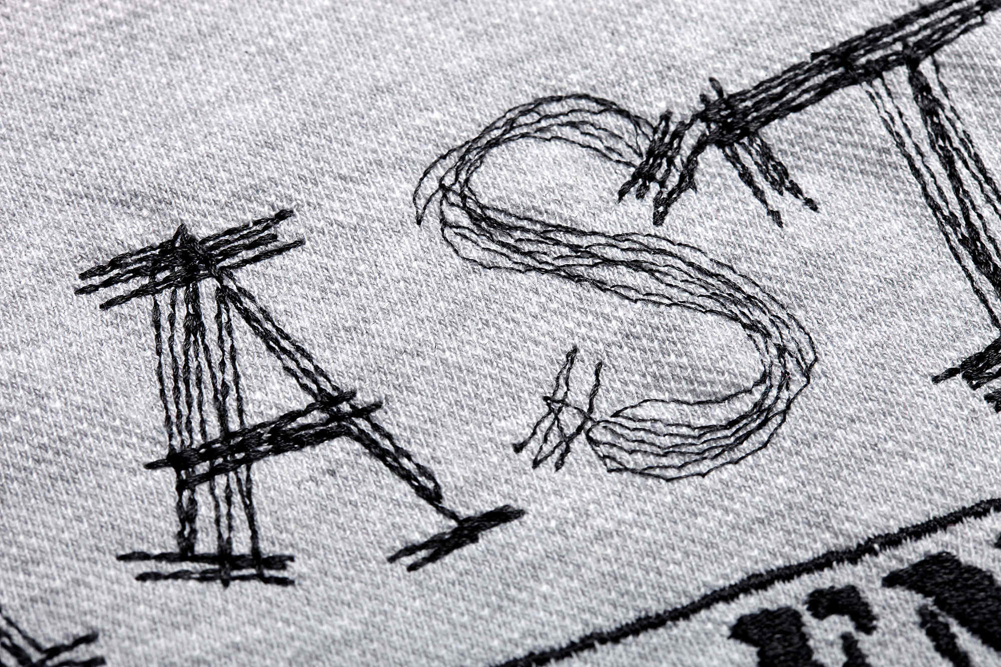 An innovative style of embroidery using a small number of stitches. Perfect for creating „light” lettering on textiles. A nice alternative for large format embroidery.